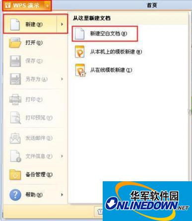 首先,打开wps演示,点击左上角上的“wps演示”按钮,在下拉菜单中选择“新建”——“新建空白文档”选项。