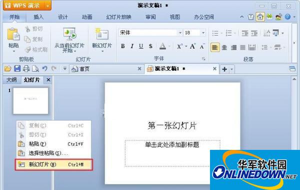 在左侧的侧边栏中,右击菜单中,选择“新幻灯片”选项,就可以插入一张新幻灯片。如下图所示: