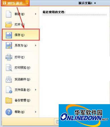 点击左上角上的“wps演示”按钮,在下拉菜单中点击“保存”按钮,或者按“ctrl+s”快捷键,弹出保存对话框。