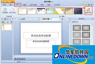 首先打开wps演示,选择菜单中“设计”下的“颜色方案”,如下图1所示:
