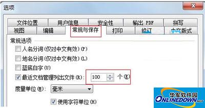 2、切换到常规与保存选项卡,在最近文档管理列出文件后选择0个,确定退出。