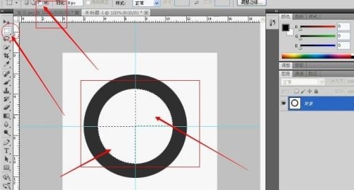 第三步:在制作标志之前我们我们需要设计参考线,用鼠标点击上面的标尺和左边的标尺分别向图片中间拉出参考线(如图所示)。