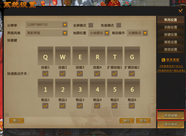 打开途径三:点击游戏页面右上角的设置图标,或者是使用快捷键“F10”打开系统设置界面,再点击页面右下角的“选择城镇”键,同样也能打开切换城镇窗口。