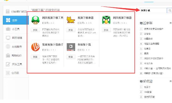(3)之后在扩展中心搜索“视频下载”等关键字,接着就会搜索出很多视频下载插件,选择一个自己喜欢的点击安装即可;