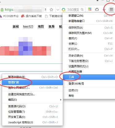 (1)先在360极速浏览器右上角“菜单”中找到“工具”,并打开“管理扩展”;