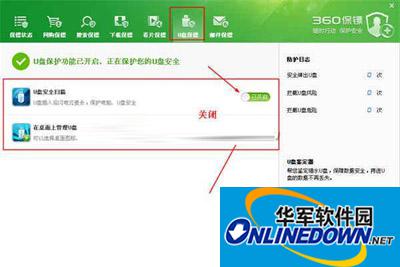 3、在360包保镖中,进入U盘保镖功能,随后关闭界面上的两项功能。