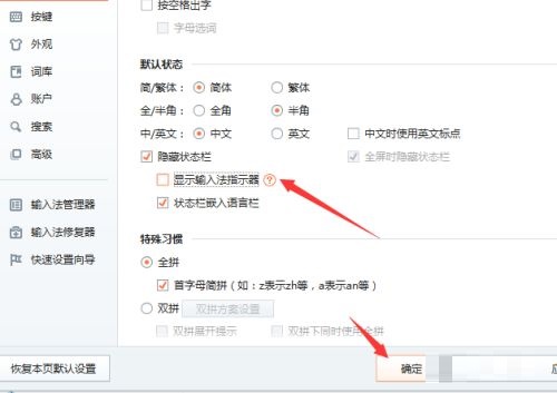 第五步:点击显示输入法指示器之后,点击确定(如图所示)。