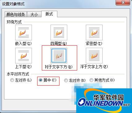 5、切换到版式选项卡,选择衬于文字下方,然后选择居中。