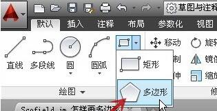1、新建一个文档,点击“默认”选项卡(图中红框)中“绘图”选项组(图中蓝框)中的“矩形”旁的下拉箭头(图中红色箭头所指)