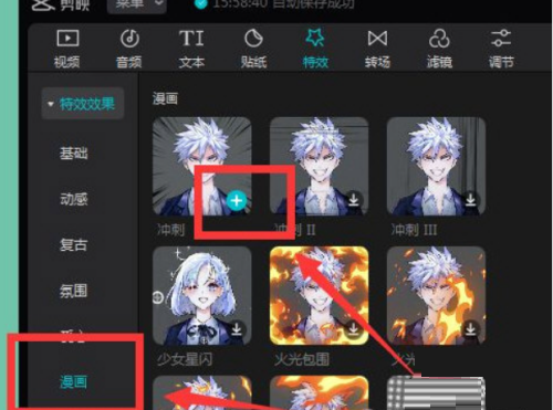 第二步:随后在视频主界面,选择特效工具,之后选择左侧的漫画,选择冲刺动漫效果。
