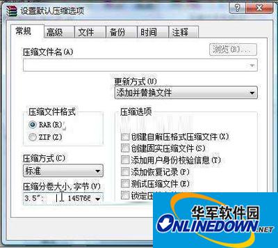进入“设置默认压缩选项”对话框,找到“压缩分卷大小,字节”选项,在下拉列表中选择“3.5“:1457664”(分卷后的文件大小可以满足装进3.5寸软盘的需要),点击“确定”按钮完成,如下图。
