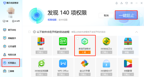 小编这里以腾讯电脑管家为例,在“权限雷达”选项中,点击“立即管理”键。待软件扫描完之后,在开机启动进程一栏中,勾选上新浪页游助手选项,再点击“一键阻止”就好了。