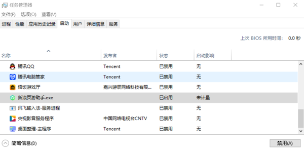 使用快捷键“Ctrl+Shift+Esc”打开电脑任务管理器,在弹出的窗口中,选择“启动”选项。页面刷新后,下滑找到新浪页游助手一栏,选中后点击右下角的“禁用”按钮就好了。