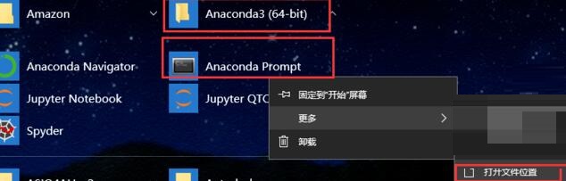 打开开始菜单,右键Anaconda Prompt,点击更多,打开文件位置。