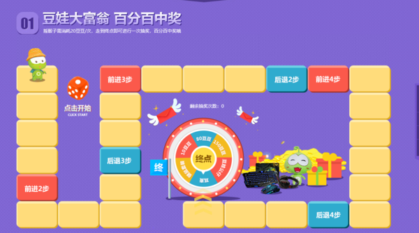 以大富翁游戏的规则,玩家只要控制豆娃走到终点站,就可以抽奖一次,而且是百分之百可以中奖。不过,要注意的是,每摇一次骰子需要消耗20豆豆,可能会得不偿失哦。