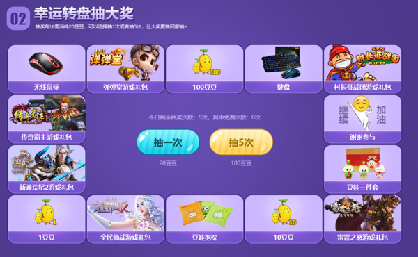 与大富翁类似,玩家也需要消耗20豆豆,就能抽奖一次。不过,幸运转盘有次数上的限制,每个账号每天只有五次机会抽奖。想要尝试一把的朋友,可以使用5连抽,直接抽取5次试试运气。