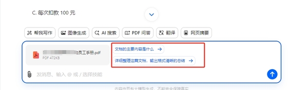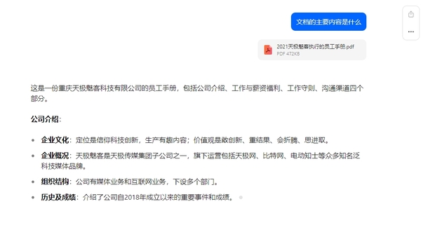 豆包AI在读取文档内容后,可以快速地告诉我们这个文档中的内容,并且可以整理文档后,生成格式清晰的总结(这个是通用的)。对于部分文档,我们还可以针对文档具体内容,让豆包去生成一些文案:比如对于员工手册,我们就可以借助豆包AI去生成员工测试题,以考核新员工对员工手册的掌握程度。对于Excel表,则可以快速生成一份数据分析的情况,从而提升工作效率。
