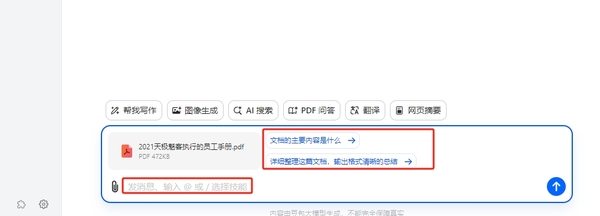 3、添加附件之后,通常豆包会给我们一些推荐问题,比如整理文档中内容之类的,当然我们也可以在对话框中直接进行提问。