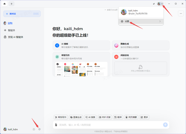 1、启动电脑端的豆包软件,然后点击界面右上角的【个人头像】右侧的【▼】图标,然后选择【设置】功能。再或者是直接点击界面底部左下角的【齿轮】设置图标。