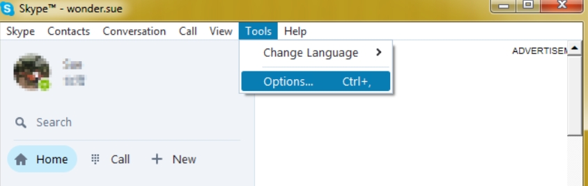 单击Skype窗口顶部菜单栏上的“工具”或“更多”(有时可能是三个点的图标或齿轮图标),然后从下拉菜单中选择“选项”或“设置”。