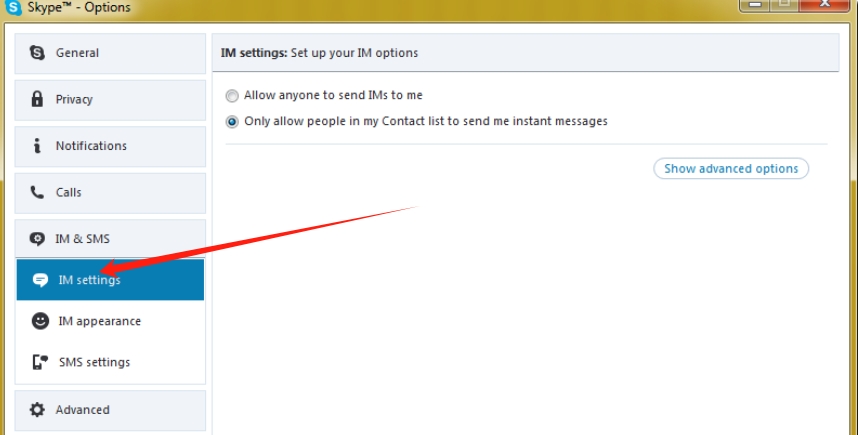 在“选项”或“设置”窗口中,找到并点击左侧菜单中的“IM & SMS”或“消息”部分。