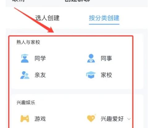 在创建群聊的页面中,您会看到多种创建方式,包括“选人建群”和“按分类创建”。点击“按分类创建”,这样您就可以根据群聊的用途选择合适的群类型。