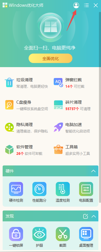 第一步,启动电脑端的windows优化大师软件,点击界面顶部右上角的个人头像图标。