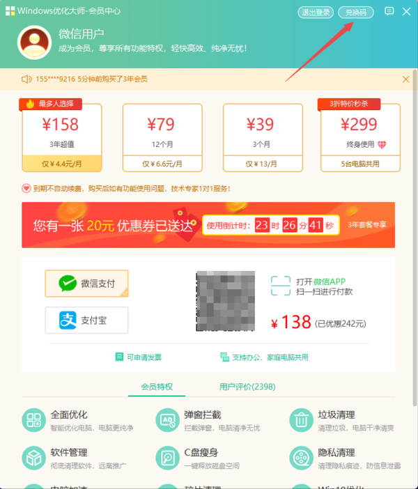 第四步,紧接着,在弹出的会员兑换窗口中,输入兑换码,然后点击【立即兑换】按钮,即可兑换window优化大师的会员了。