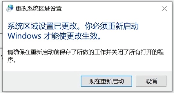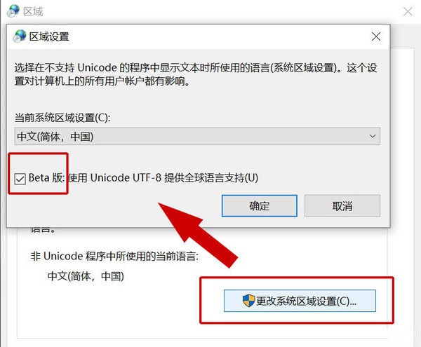 更改系统区域设置——弹出的对话框中,选择“Beta版:使用Unicode UTF-8 提供全球语言支持(U)”。