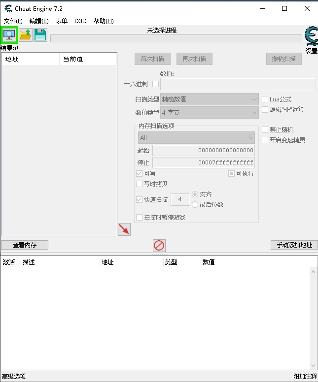 Cheat Engine是国外的一款非常优秀的内存修改软件,用这个软件的游戏爱好者不计其数,他不但可以修改Flash游戏,对其他单机游戏也同样所向披靡。Cheat Engine的用法也不是很复杂,首先是要先打开游戏,然后打开Cheat Engine,点击左上角的那个电脑图标,在弹出来的框中选择游戏进程,然后选择扫描类型和数值类型,进行扫描并修改,