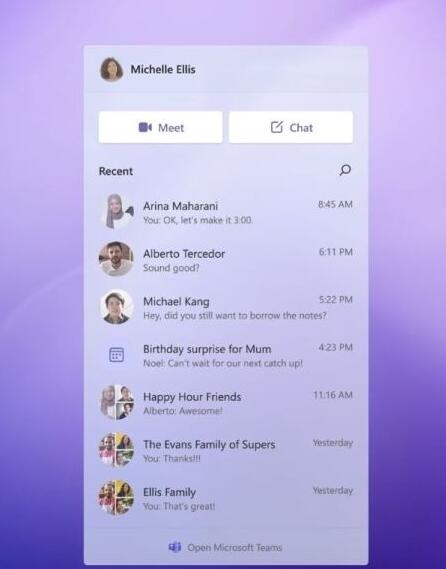 Microsoft Teams取代Skype成为Win11的默认通讯工具,与之对应的“人脉”、“MeetNow”也被一并替换。相比Win10版Skype,Microsoft Teams更加注重于团队的沟通与协同,特别是它在微软Office