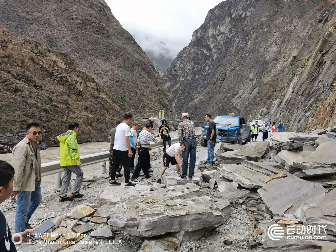 在行至哈尼族彝族自治县,穿过怒江大桥约300米,当地的一处山坡出现滑坡现象,堆积的石块让行程受阻。行摄团队不得不走出车外,合力将堵塞道路的石块搬走。