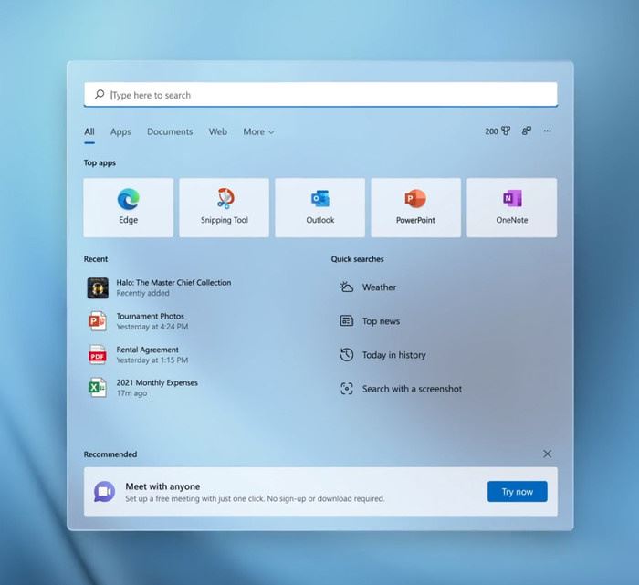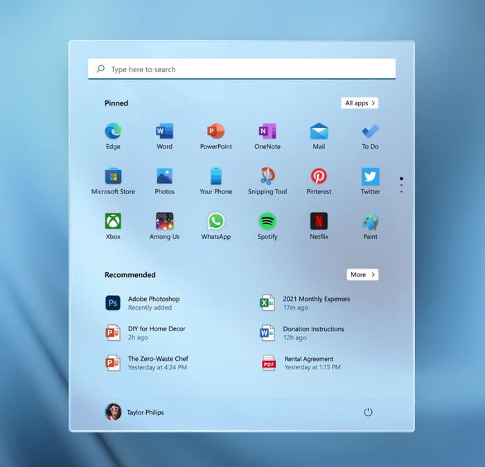 与泄露版相比,Win11 的开始菜单除了继承了圆角、毛玻璃这些外观属性外,一个最明显变化就是增加了搜索栏。动态磁贴被彻底删除,取而代之是简化后的“图标”以及由算法驱动的推荐列表。之前我们曾以为这里将是 Win10“最近使用文档”的一个翻版,但从最新的截图看,它似乎更应被看作是“最近使用文档 + 最常用程序”的一个组合体。与此同时,居中式任务栏板上钉钉,无论新装还是升级应该都是默认出现。当然微软依旧还会提供给我们一个开关,用以恢复之前的使用习惯。
