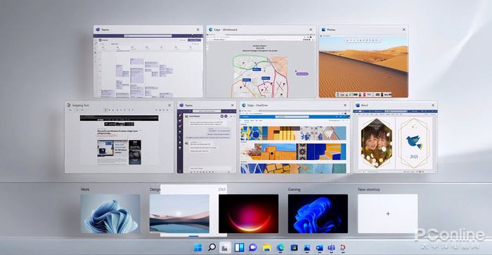 Win11 完善了虚拟桌面功能,在原有基础上允许各个“桌面”拥有自己的主题、壁纸、名称。新设计调整了桌面工具栏位置,以方便触屏用户快速取用。顺带说一句,Win11 在触屏手势上也有更多选择,平板用户将有拥有更好的操作体验。