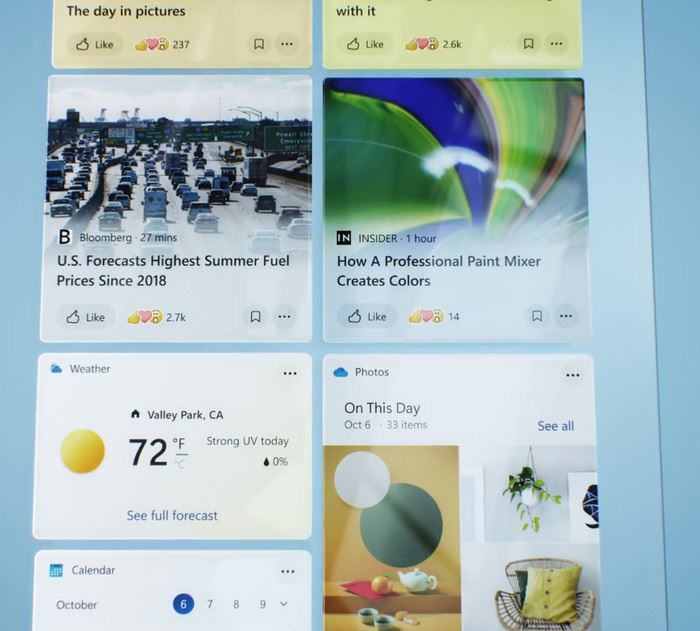小组件取代了之前的动态磁贴,除了泄露版中看到的资讯与天气外,还新增了日历、行程、照片等功能。作为动态磁贴的延伸,小组件在扩展性与可交互性方面变得更为出色,除了可以自由地编辑小组件外,还增加了更多的互动化按钮。当然与此对应的,Win10 里的“资讯和兴趣”也将被其取代,所有任务将统一归纳入小组件面板。