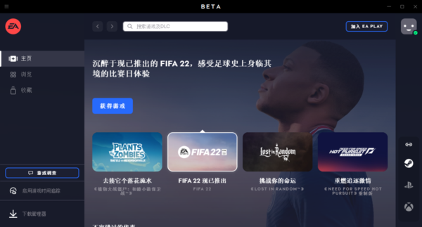 EA桌面(EA?Desktop)也叫EA应用程序,其实它也是EA旗下的游戏平台,也可以供我们在上面浏览EA游戏资讯或者畅玩EA游戏,但是从另一个角度讲,EA桌面是对于Origin的一个革新,我们在EA桌面上可以玩到更加新颖的功能,获得更加卓越的用户体验;而且从视觉上,界面采用深蓝色与红色的设计,更加突显高级感,让用户从视觉上就感觉,EA是在革新,是在升级。