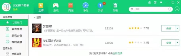 在电脑上安装有360软件管家,或者腾讯软件管理的小伙伴,可以打开这类软件,搜索梦三国2进行下载。不过要注意搜索出来的软件版本信息,有可能是梦三国1的内容。
