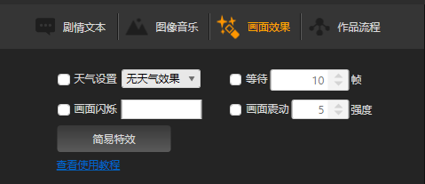 想要使用橙光文字游戏制作工具画面特效的小伙伴,可以在打开橙光文字游戏制作工具并转到对应的作品剧情中之后,点击作品预览框下方的“画面特效”键。在弹出的选项中,选择需要添加的特效,比如说天气、画面震动、闪烁等。