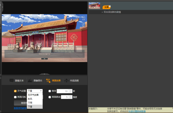 在作品中找到需要添加天气特效的剧情之后,勾选上天气设置前的方框,并在天气效果中选择具体的天气内容就可以了,这里可选的天气有:刮风、下雨和下雪。