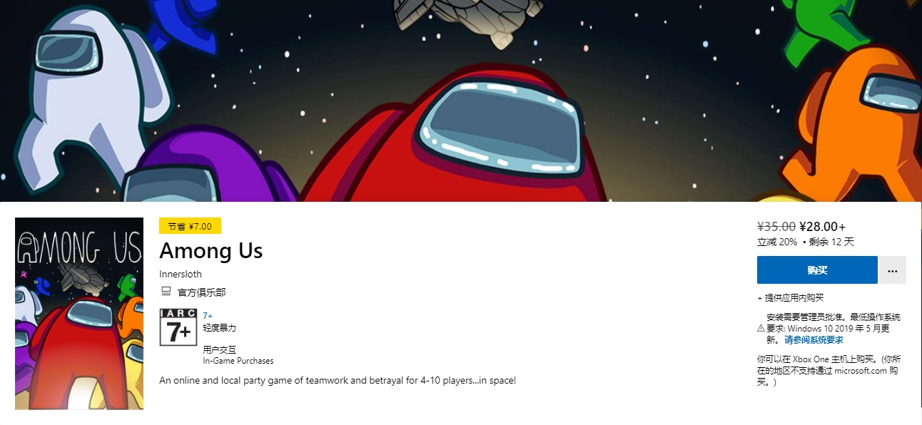 最近热销的策略休闲游戏《Among Us》已经上线微软应用商店,限时售价 28 元。