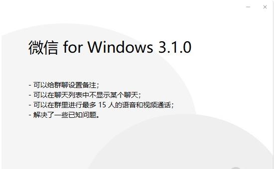 微信近期发布了 Windows 微信 3.1.0 测试版,带来了几个新的功能。本次Windows 微信 3.1.0 测试版更新新增群聊设置备注,聊天列表中不显示某个聊天,群里进行最多 15 人的语音和视频通话功能,还解决了一些已知问题。