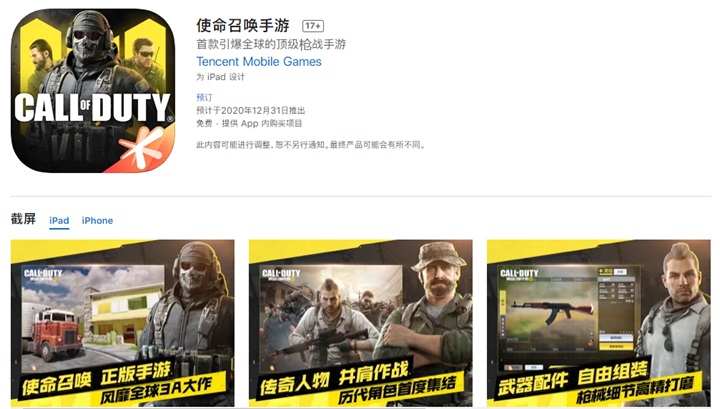 近日,《使命召唤手游》现已登陆国区苹果 App Store,预计于 2020 年 12 月 31 日推出。