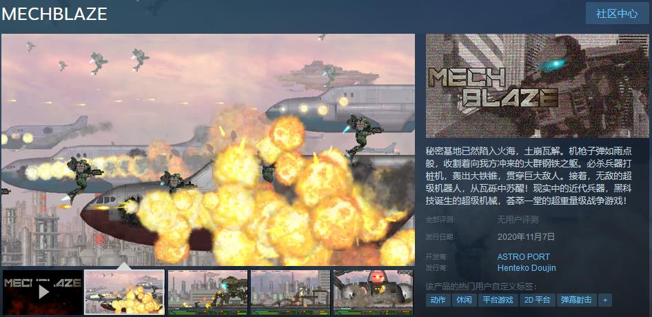 《MECHBLAZE》是一款ASTRO PORT制作Henteko Doujin发行的2D平台机甲弹幕射击游戏,秘密基地已然陷入火海,土崩瓦解。机枪子弹如雨点般,收割着向我方冲来的大群钢铁之躯。必杀兵器打桩机(Pile Banker),轰出大铁锥,贯穿巨大敌人。接着,无敌的超级机器人,从瓦砾中苏醒!