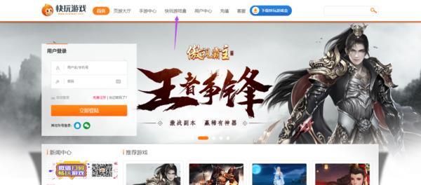 在电脑的浏览器中输入【快玩游戏】然后找到官网并点击进入,接着点击官网界面顶部的【快玩游戏盒】选项卡。