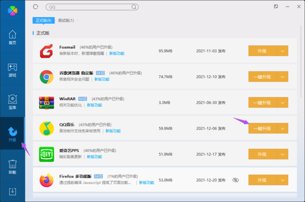 打开电脑管家的软件管理功能,然后点击左侧的【升级】选项,在此列表中会显示电脑上可以更新升级的软件,如果快玩游戏盒软件有更新的话,就会在该列表中显示,最后我们只需要点击软件右侧的【升级】按钮即可。
