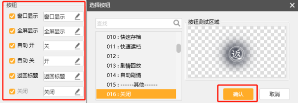 按钮设置主要有六个功能选项,分别对应窗口播放大小,作品播放方式,重新开始以及关闭等功能。六个按钮的功能设置,软件后台都有预定程序,用户只能对按钮图片式样进行修改。