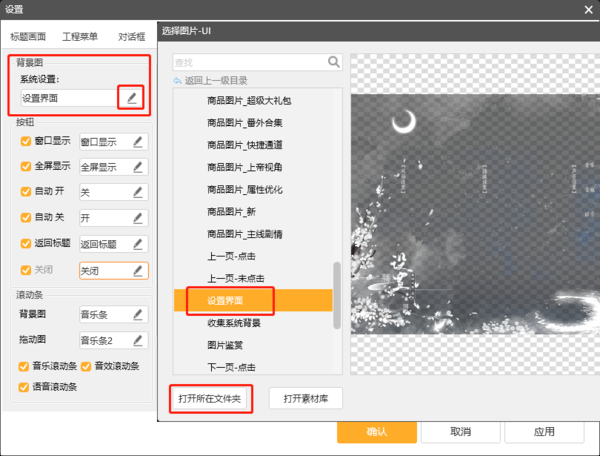 点击设置背景框中的小铅笔,在弹出的选择图片窗口,可以直接选择其他图片,也可以点击下方的“打开所在文件夹”,选择电脑本地图片,注意需要提前将图片放置到UI文件夹中。