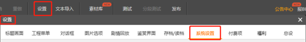 打开橙光文字游戏制作工具客户端后,新建一个作品,正式进入到作品编辑页面后,点击上方的“设置”字样,在弹出的设置窗口中,选择“系统设置”就可以了。
