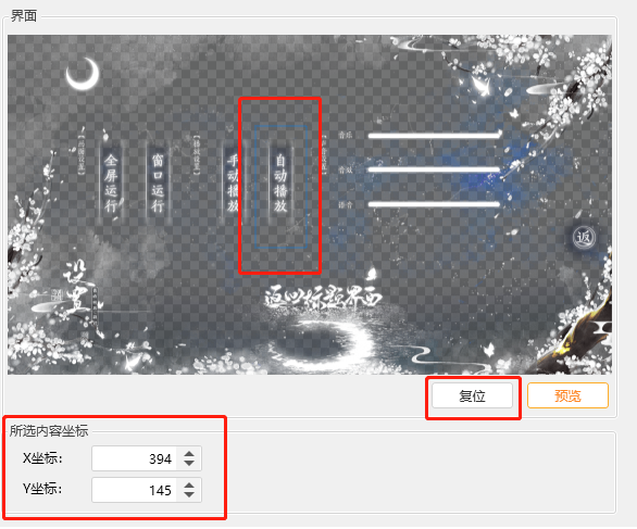 所选内容坐标设置,主要是用来进行作品页面布局的,选择预览窗口中的组件后,可以直接拖拽调整,也可以在手动输入数值调整。对更改的效果不满意的话,可以点击复位键,回到默认的位置再重新设置。
