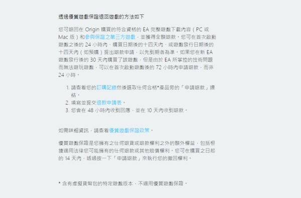 并且如果我们在新EA游戏发行后的30天内购买了该游戏,但是由于EA所掌控的技术问题而无法游玩游戏,可以在首次启动游戏后的72小时内申请退款,而非24小时。